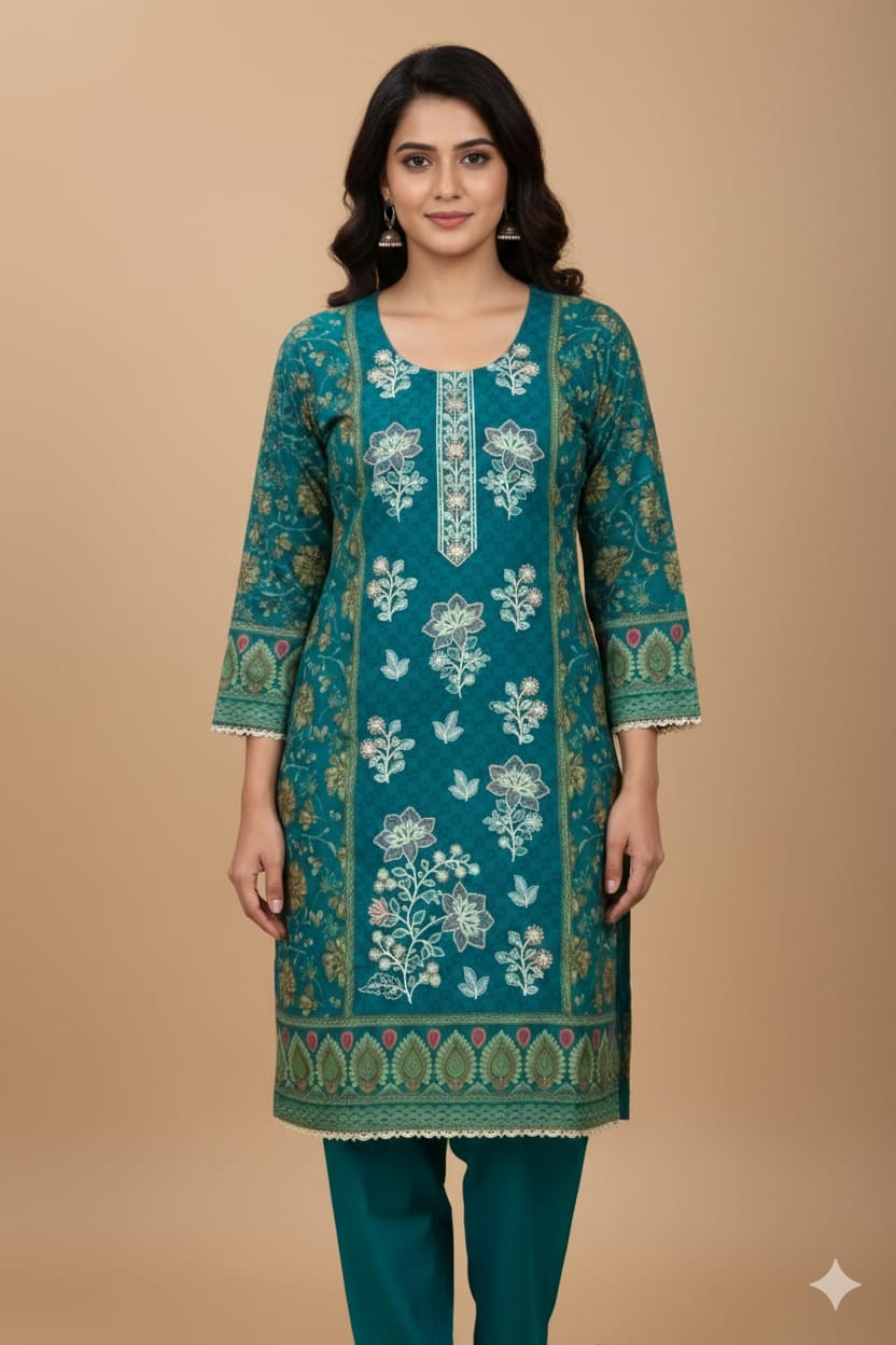This is an embroidered dhanak 3-piece dress in a graceful teal green shade with soft gold and ivory accents. The shirt features a finely embroidered front panel, which adds richness and elegance to the design, while the remaining areas are enhanced with subtle printed floral motifs. The neckline, sleeves, and hem are beautifully finished with coordinated printed borders, giving the outfit a traditional yet refined look. The straight-cut silhouette ensures both comfort and a flattering fit.
