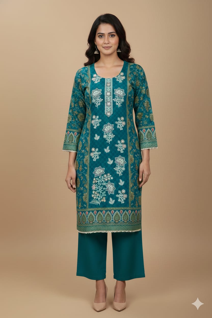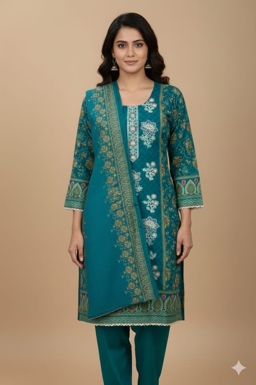 The dress is paired with matching solid teal green dhanak trousers, providing a clean and balanced appearance. A coordinated printed dhanak dupatta completes the set, featuring complementary patterns and decorative borders that tie the whole look together. Overall, this embroidered dhanak 3-piece suit combines warmth, comfort, and timeless style, making it perfect for daily wear and casual winter gatherings.