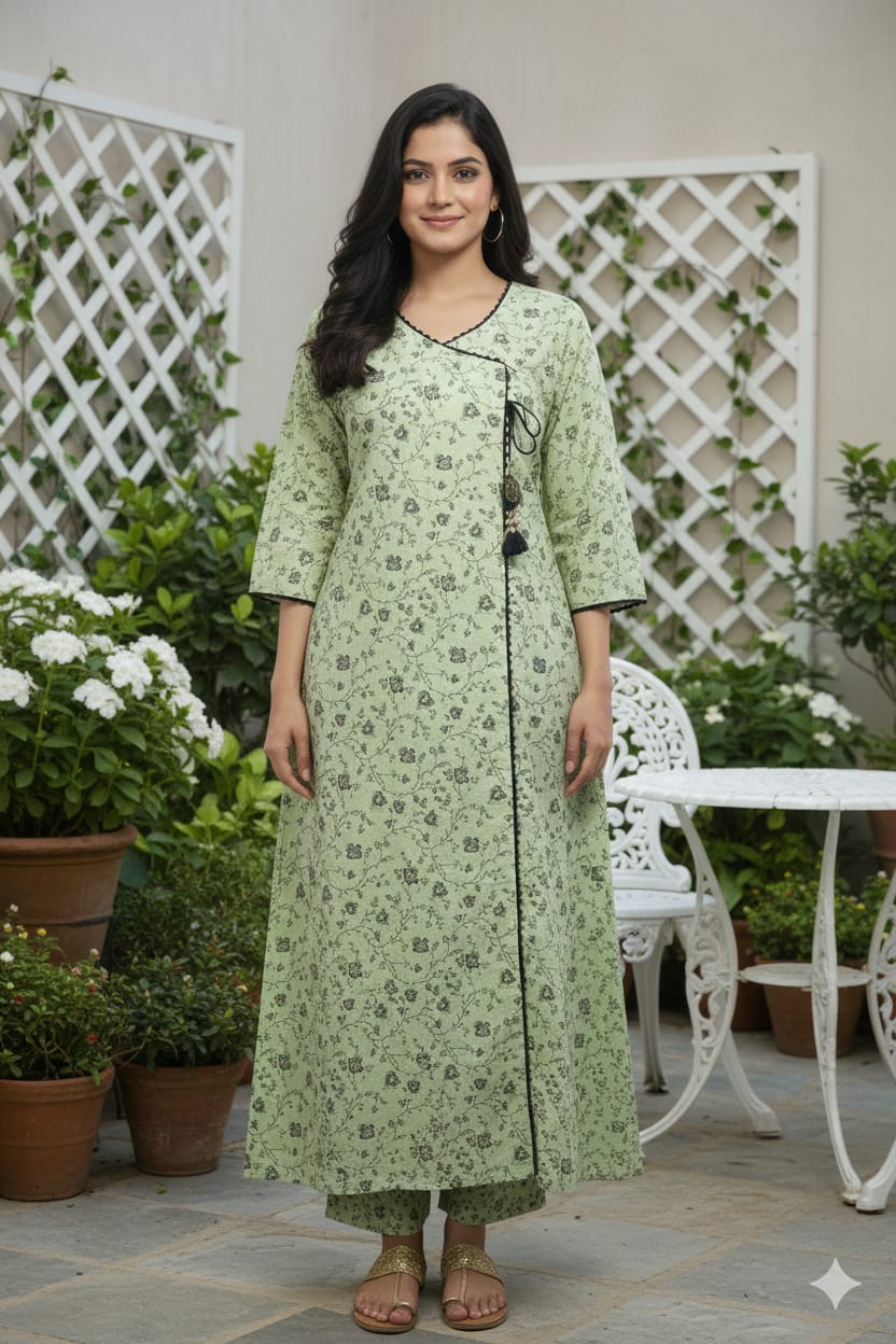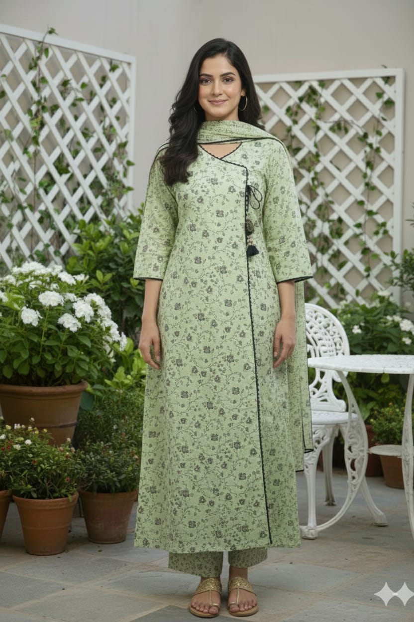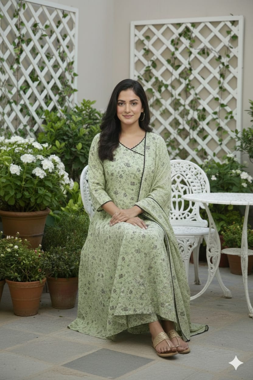 This outfit is a cotri angrakha-style maxi, designed in a soothing tea green shade with an all-over delicate floral print. The maxi features a classic angrakha overlap cut, beautifully highlighted with black lacing that runs along the neckline, cross-front border, and sleeve edges, adding a refined contrast to the overall look. The silhouette is relaxed and flowy, ensuring comfort while maintaining a graceful appearance. It comes with a ready-to-wear dupatta, also finished with matching black lace detailing, perfectly complementing the angrakha maxi. Paired with straight trousers in the same print, this ensemble offers an elegant, effortless, and timeless style ideal for casual and semi-formal occasions.