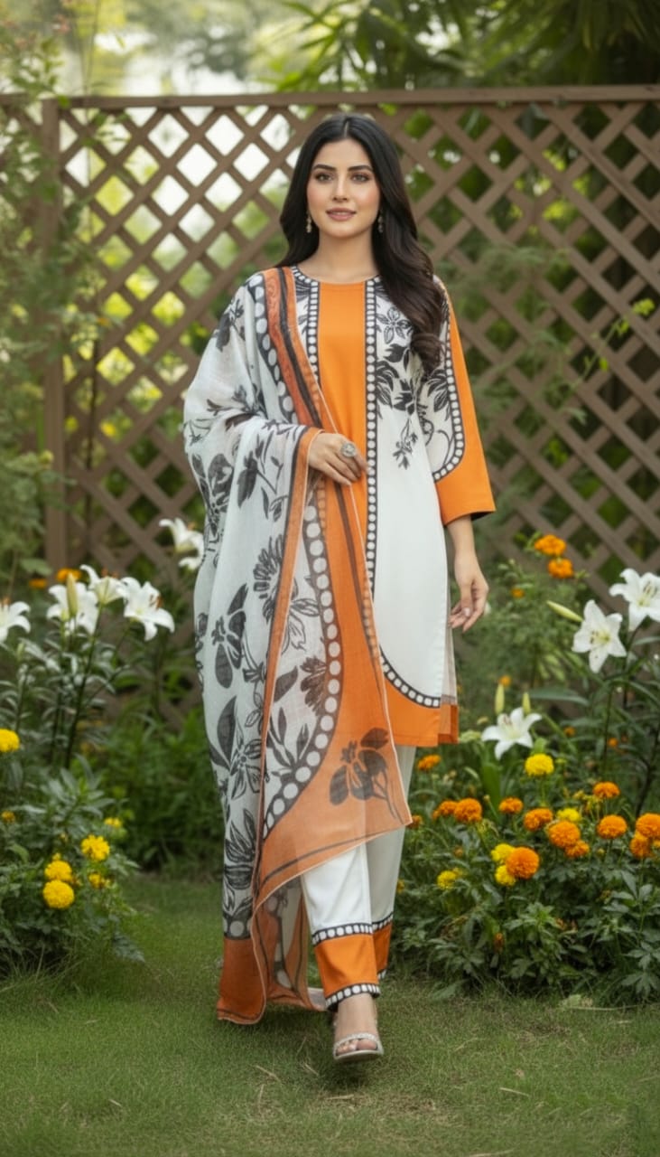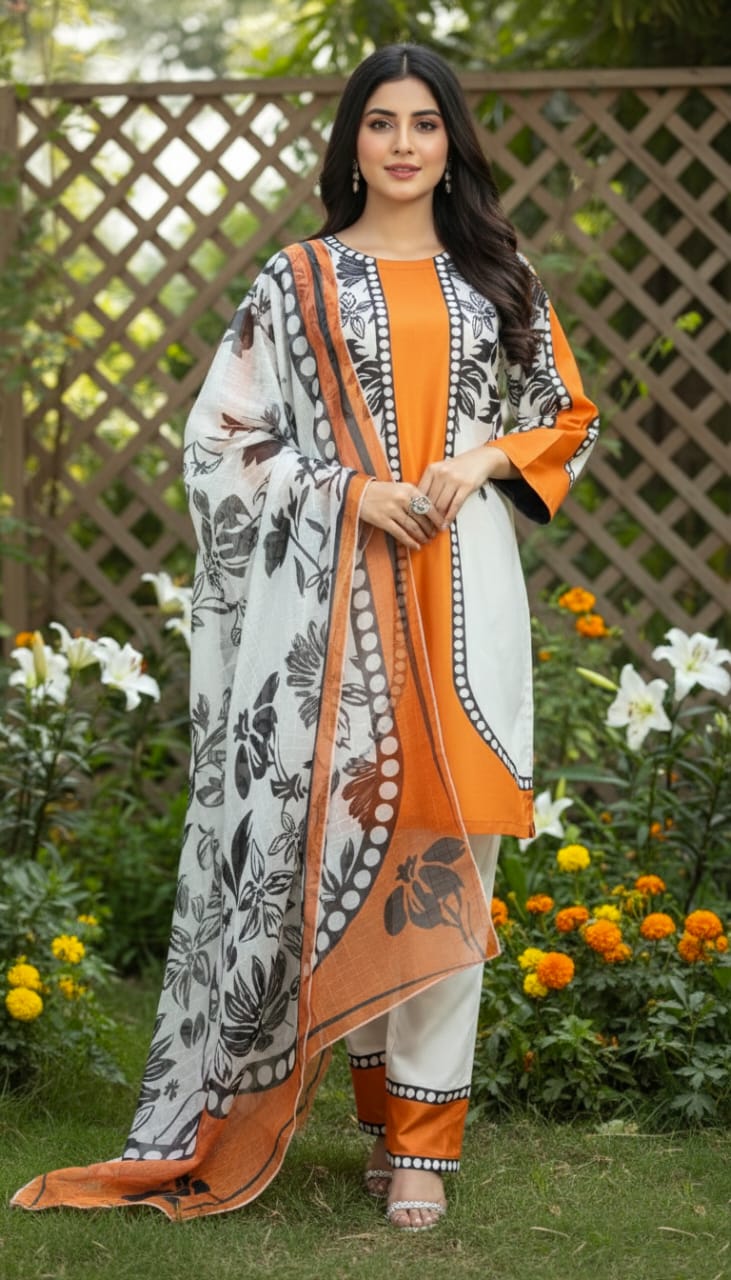 Paired with white trousers adorned with matching orange and black border detailing, the outfit maintains a graceful yet modern vibe. The beautifully printed Monar dupatta showcases a bold black floral pattern over an off-white and orange-toned base, completing the look with artistic finesse.