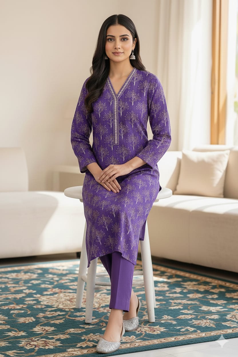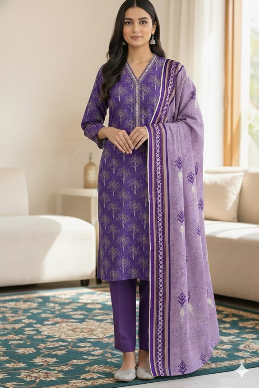 This is a lightweight printed khaddar 3-piece dress in a beautiful deep purple and soft lavender color palette. The shirt is crafted from breathable, lightweight khaddar, making it comfortable for all-day wear. It features an elegant all-over print with subtle traditional motifs, complemented by a neatly designed neckline with fine printed detailing that adds a refined touch. The straight cut of the shirt gives it a graceful and timeless appearance.