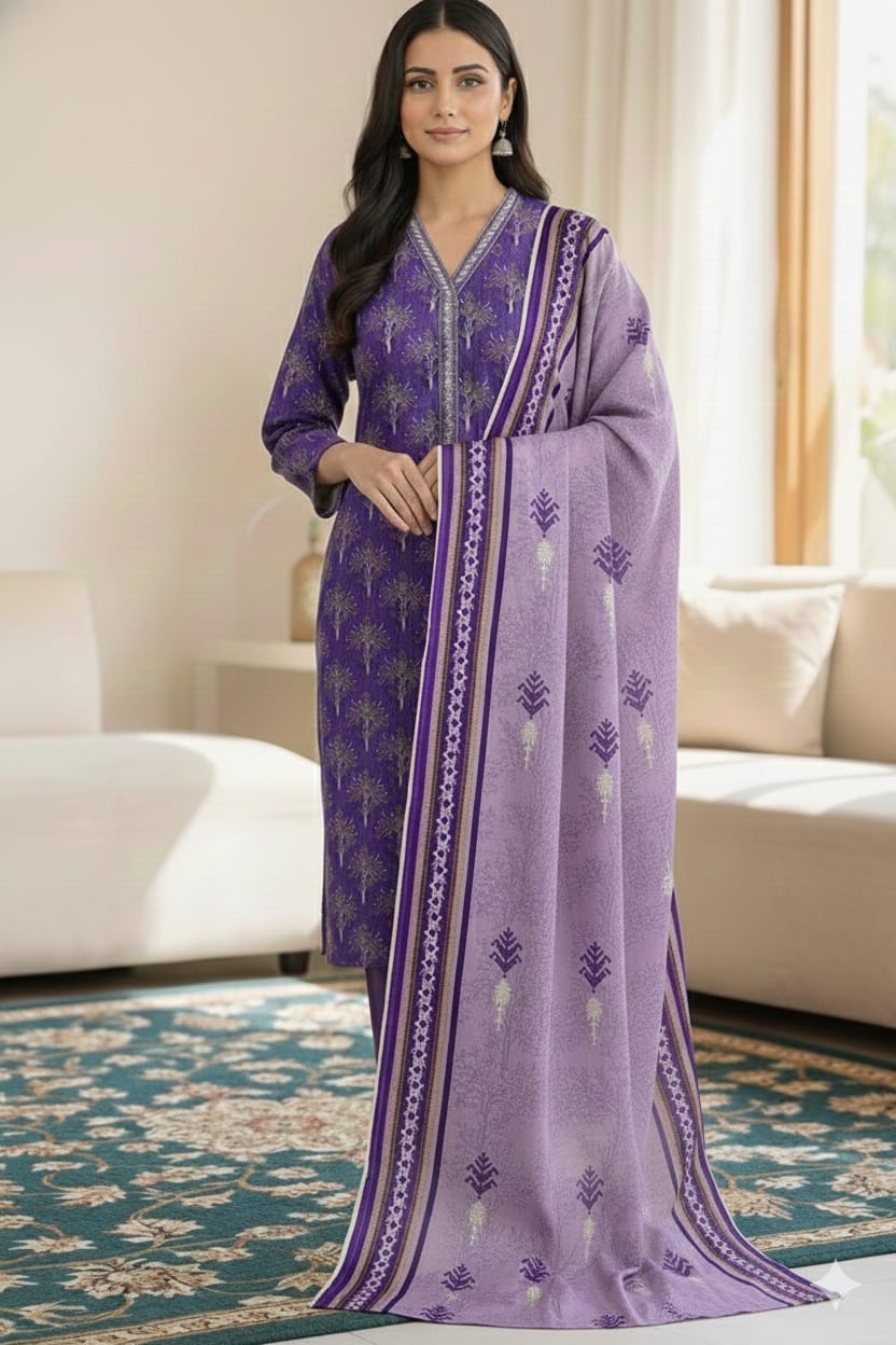 The outfit includes matching solid purple lightweight khaddar trousers, creating a balanced and polished look. The set is completed with a coordinated lightweight khaddar dupatta in a lighter lavender shade, enhanced with delicate printed motifs and a decorative border along the edges. Overall, this lightweight khaddar 3-piece suit combines comfort, softness, and classic style, making it ideal for casual wear and semi-formal occasions.