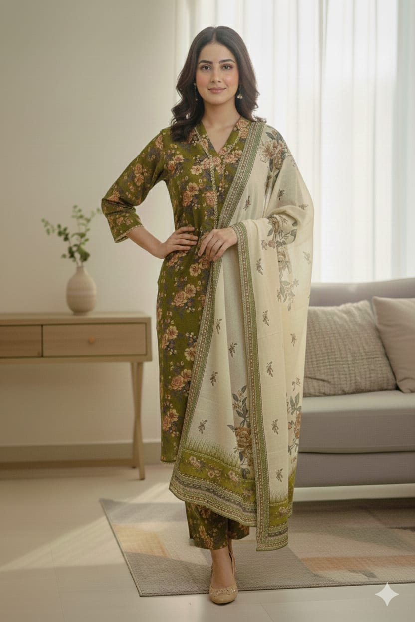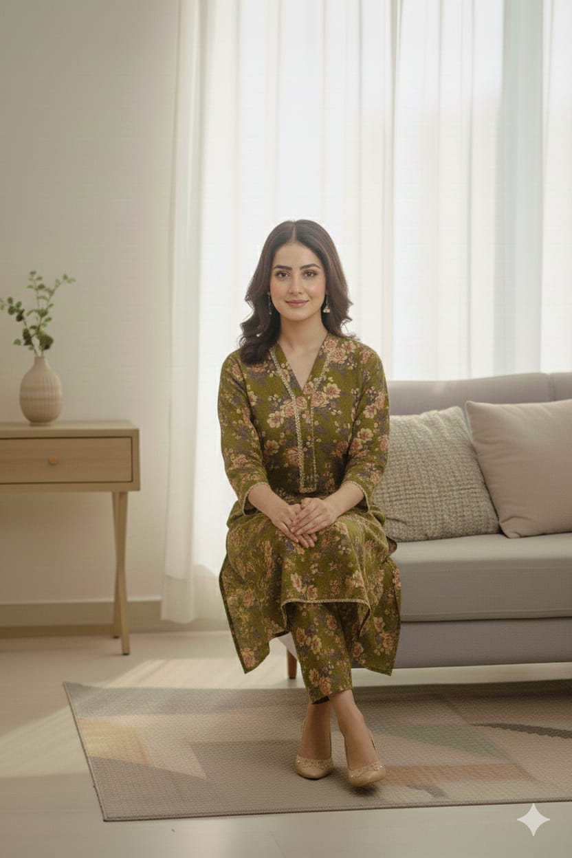 This refined 3-piece suit is crafted from lightweight khaddar, designed in warm winter tones and featuring an olive-green printed shirt adorned with soft floral patterns that add elegance and charm. The shirt is tailored in a straight cut with a bann-style neckline (band galla) and sleeves, giving it a neat, graceful, and modern look. Paired with matching printed khaddar trousers, the outfit maintains a perfectly coordinated appeal. The ensemble is completed with a soft beige khaddar dupatta, beautifully decorated with delicate botanical motifs and bordered with subtle green accents, enhancing its overall sophistication. Comfortable, stylish, and breathable, this lightweight khaddar outfit is an ideal choice for daytime wear, office dressing, or casual winter gatherings.