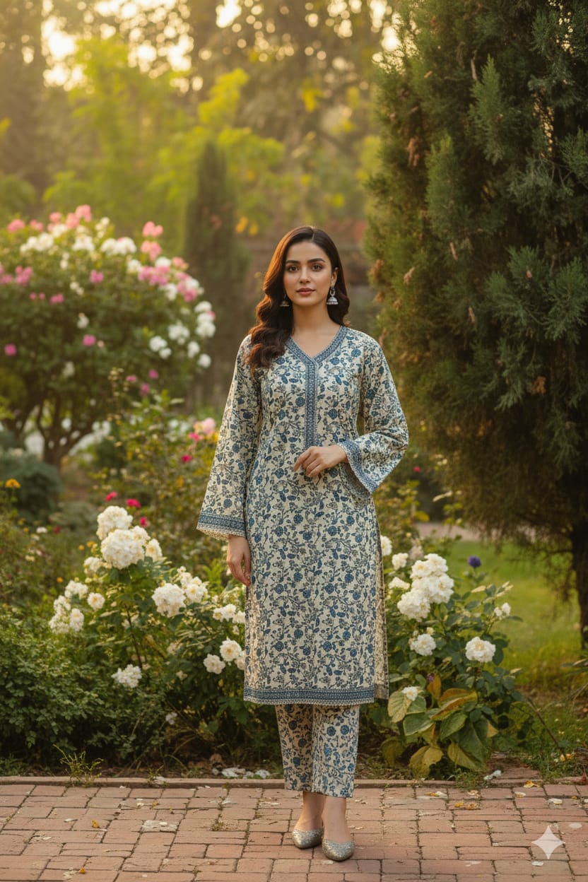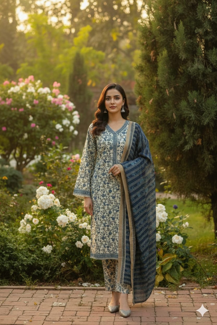 Refresh your everyday winter style with this beautiful three-piece Khaddar suit, designed in a soft, lightweight khaddar fabric that offers warmth without heaviness. The printed shirt features delicate blue floral patterns on a soft beige base, enhanced with a neatly detailed neckline and subtle borders on the sleeves and hem for a clean, balanced look. It is paired with a matching printed trouser that keeps the look coordinated and comfortable for daily wear. The outfit is completed with a softly textured printed khaddar dupatta, finished with classic striped patterns and a contrasting border that adds a graceful finishing touch. Breathable, soft, and easy to carry, this light-weight khaddar three-piece set is ideal for casual outings, workwear, and comfortable all-day winter styling.